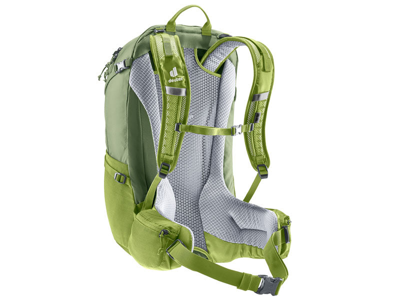 - Deuter Aircomfort: Questo nuovo sistema dorsale a rete coniuga massima ventilazione, comfort ergonomico e leggerezza. L’innovativa struttura del pannello delle alette lombari e il fluido passaggio alla rete dorsale aderiscono strettamente, assicurando una comoda vestibilita'.